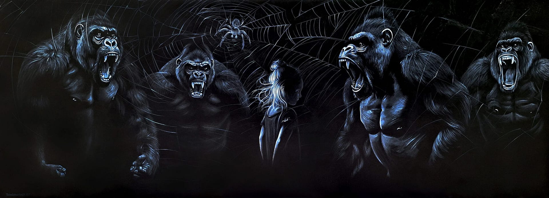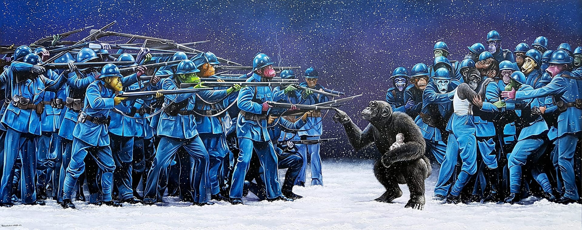 The paintings in Mohammad Tabatabai’s new collection, while appearing surreal and imaginative, also have a realistic touch. They reveal the deepest fears and worries of people in today’s world, where artificial intelligence and human-like robots are becoming more prevalent. His paintings project into a possible future and have a prophetic aspect. In a harsh and apocalyptic world of painting, there is no trace of humans. From the astonished and bewildered gaze of the NFT monkeys, it is evident that they have never seen such a being before. It’s as if humans have long disappeared from the Earth’s stage, and the NFT monkeys have taken their place, mimicking human figures and behaviors. The human infant in the hands of a real monkey, like a precious and innocent secret, might be the last human on Earth, unaware of their future, surrounded by alien-like creatures among the monkeys. But behind this appearance and the ominous prediction of the disappearance of human presence, perhaps this last human on Earth in the embrace of a real monkey (a reminder of our ancestors) could be the first new historical human born again after all the hardships and fears. Maybe a new chapter in history is beginning.